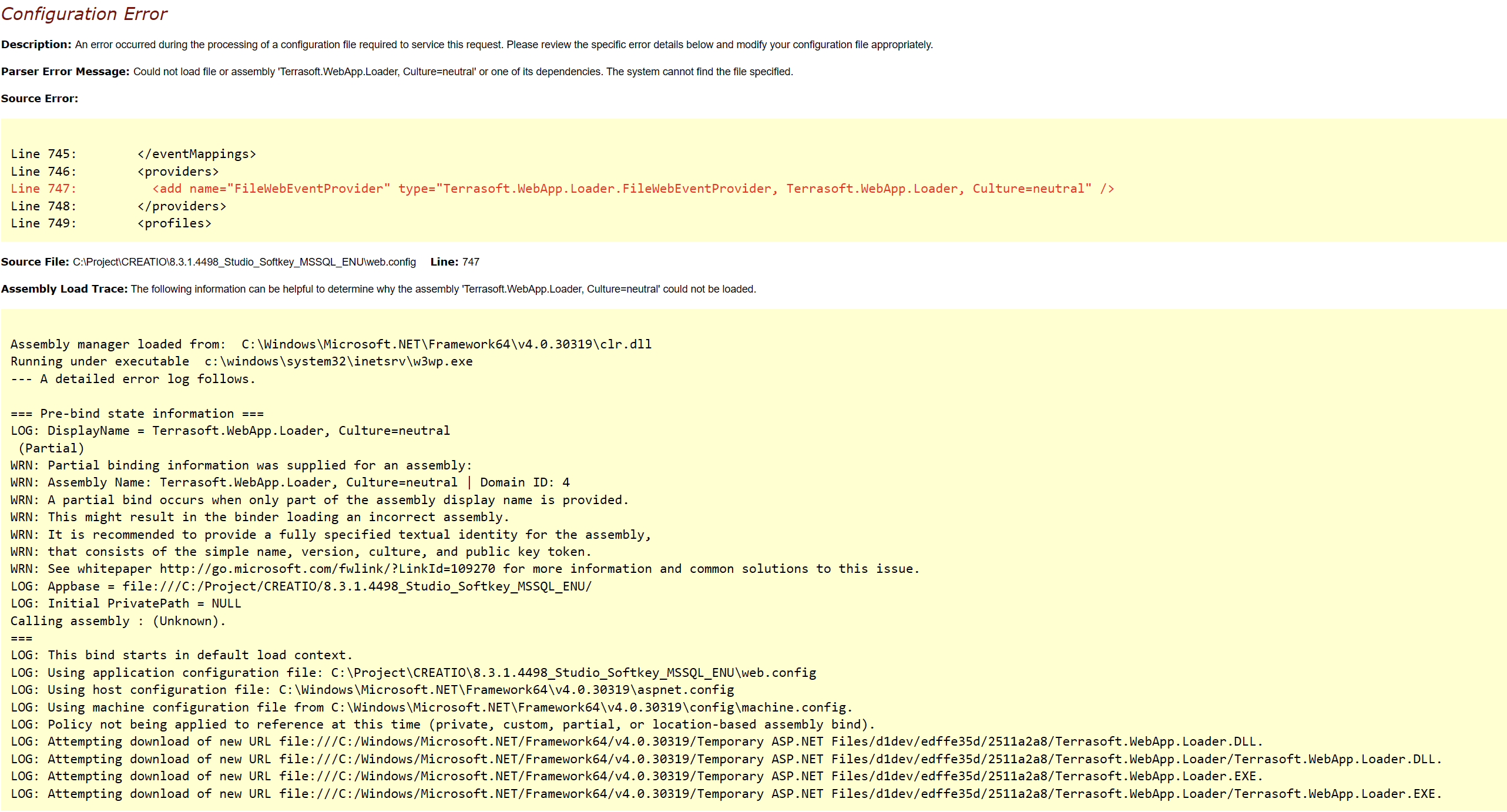 Could not load file or assembly 'Terrasoft.WebApp.Loader, Culture=neutral'