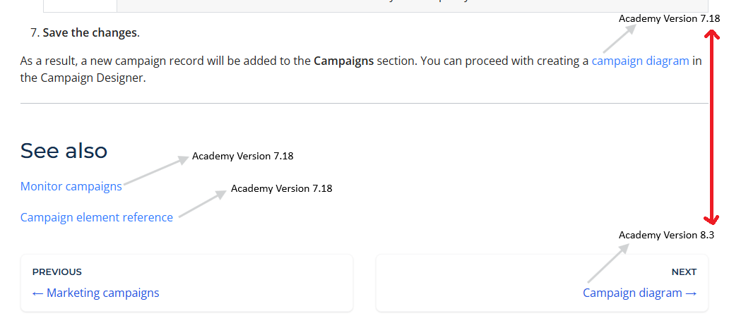 As a simple example of the kind of issue this would help surface: The Academy article "Add a campaign" (Creatio 8.3+) contains hyperlinks redirecting to Academy Articles intended for Creatio Version 7.18, as well as completely different articles being referenced for "Campaign Diagram" within the body (-> Campaign element reference, 7.18) and the bottom section (-> Set up campaign diagram, 8.3) of the Article.
