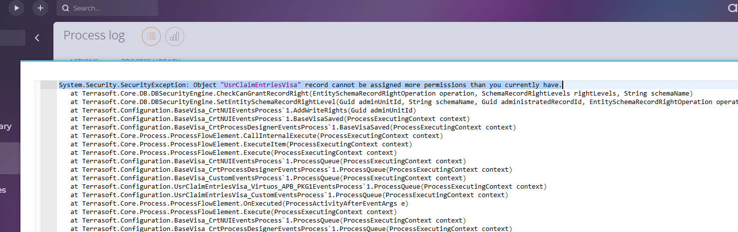 System.Security.SecurityException: Object "UsrClaimEntriesVisa" record cannot be assigned more permissions than you currently have.