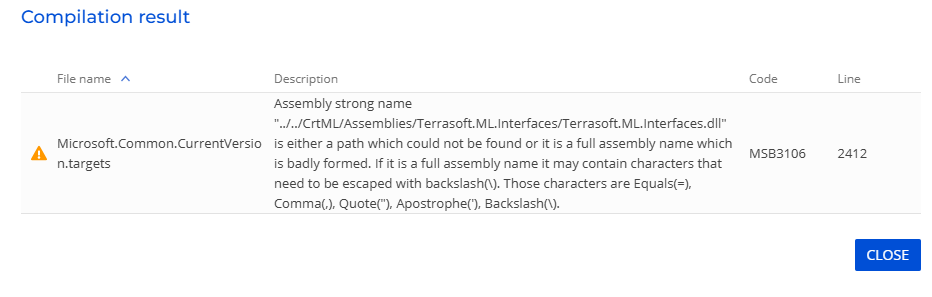 "../../CrtML/Assemblies/Terrasoft.ML.Interfaces/Terrasoft.ML.Interfaces.dll" is either a path which could not be found or it is a full assembly name which is badly formed. If it is a full assembly name it may contain characters that need to be escaped with backslash(\). Those characters are Equals(=), Comma(,), Quote("), Apostrophe('), Backslash(\).