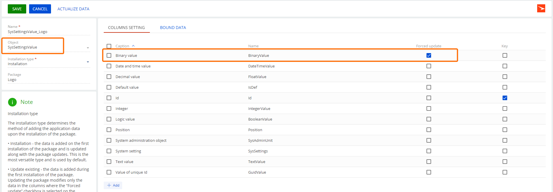 2. Включите принудительное обновление для колонки BinaryValue. На вкладке «Настройки колонок» найдите: BinaryValue и включите опцию Принудительное обновление.