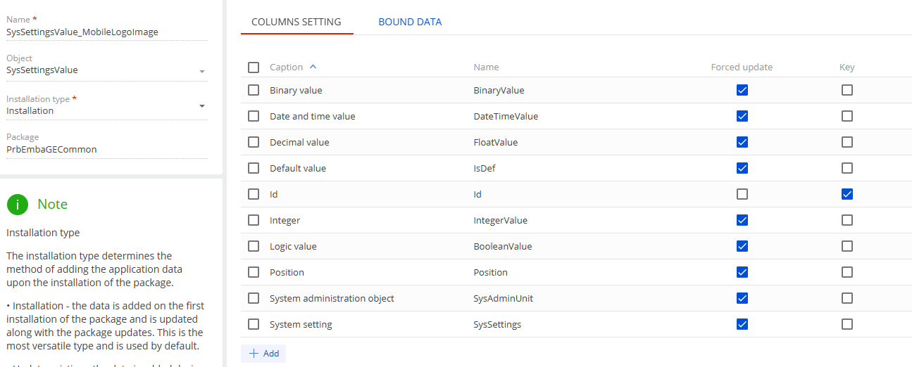 1. Привязка данных для SysSettingsValue создана, включая настройку MobileLogoImage.