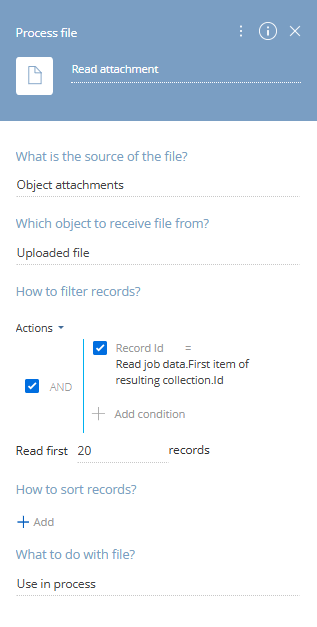 I have written an business process to send an email with attachment. I have added process file element and reading the files from "Uploaded file" object. Refer below: