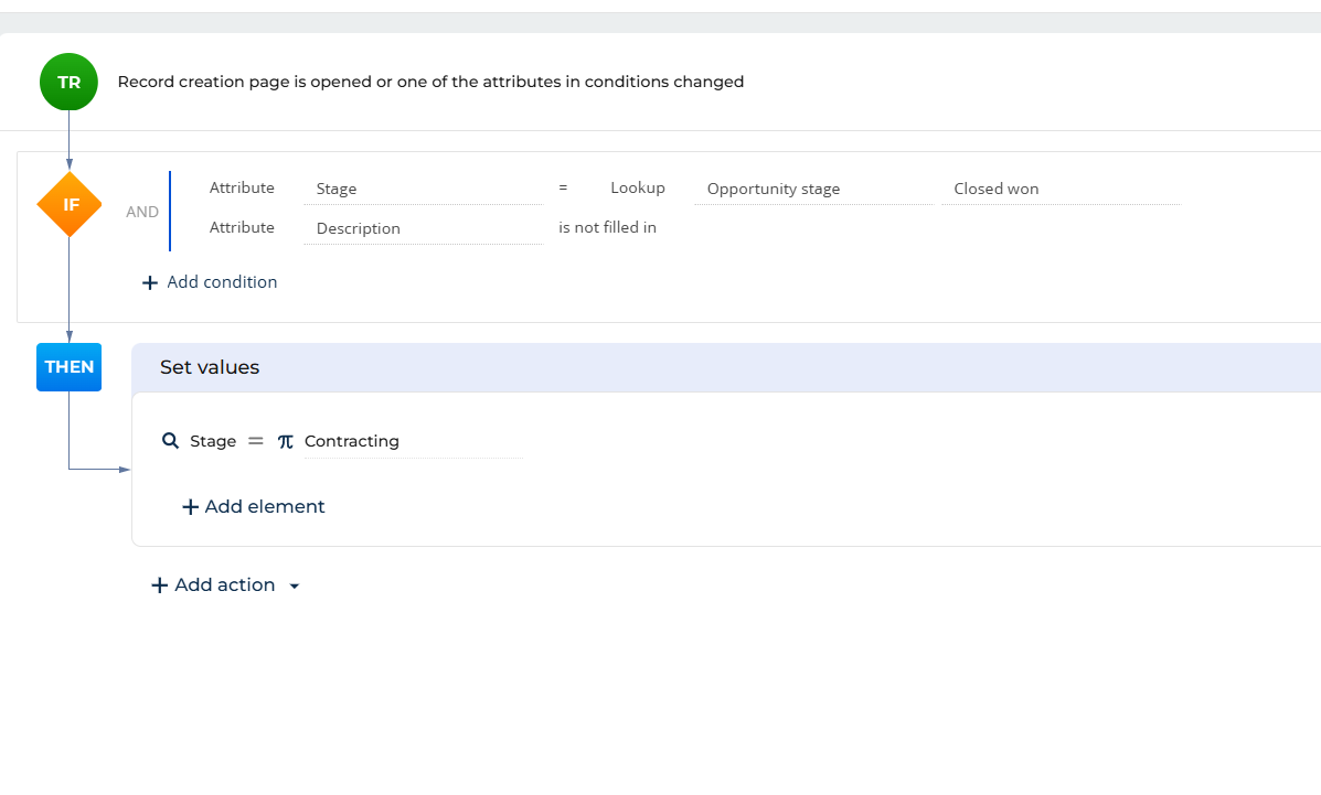 In this example, the Stage is reverted to Contracting when the Description field is not filled in. Depending on your specific business requirements, you can leverage Business Rules functionality in different ways.