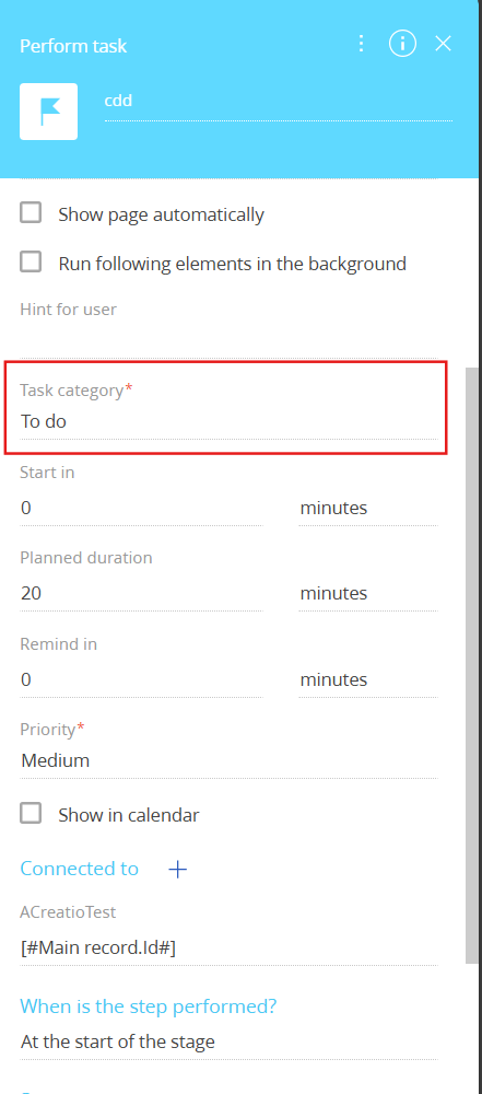 In order for this options to appear, the Task Category selected in the Perform Task element must also be added to the category list of the lookup record you would like to make available for this type of task.